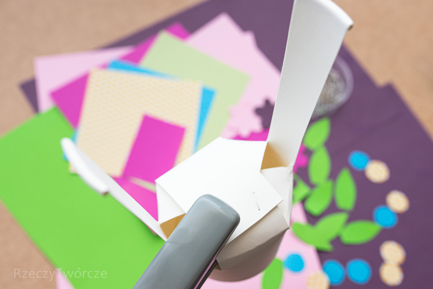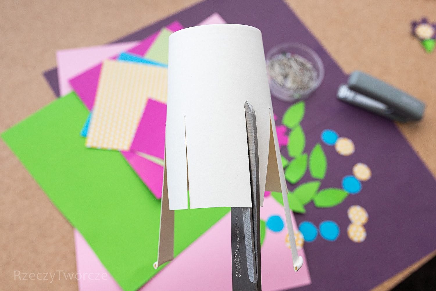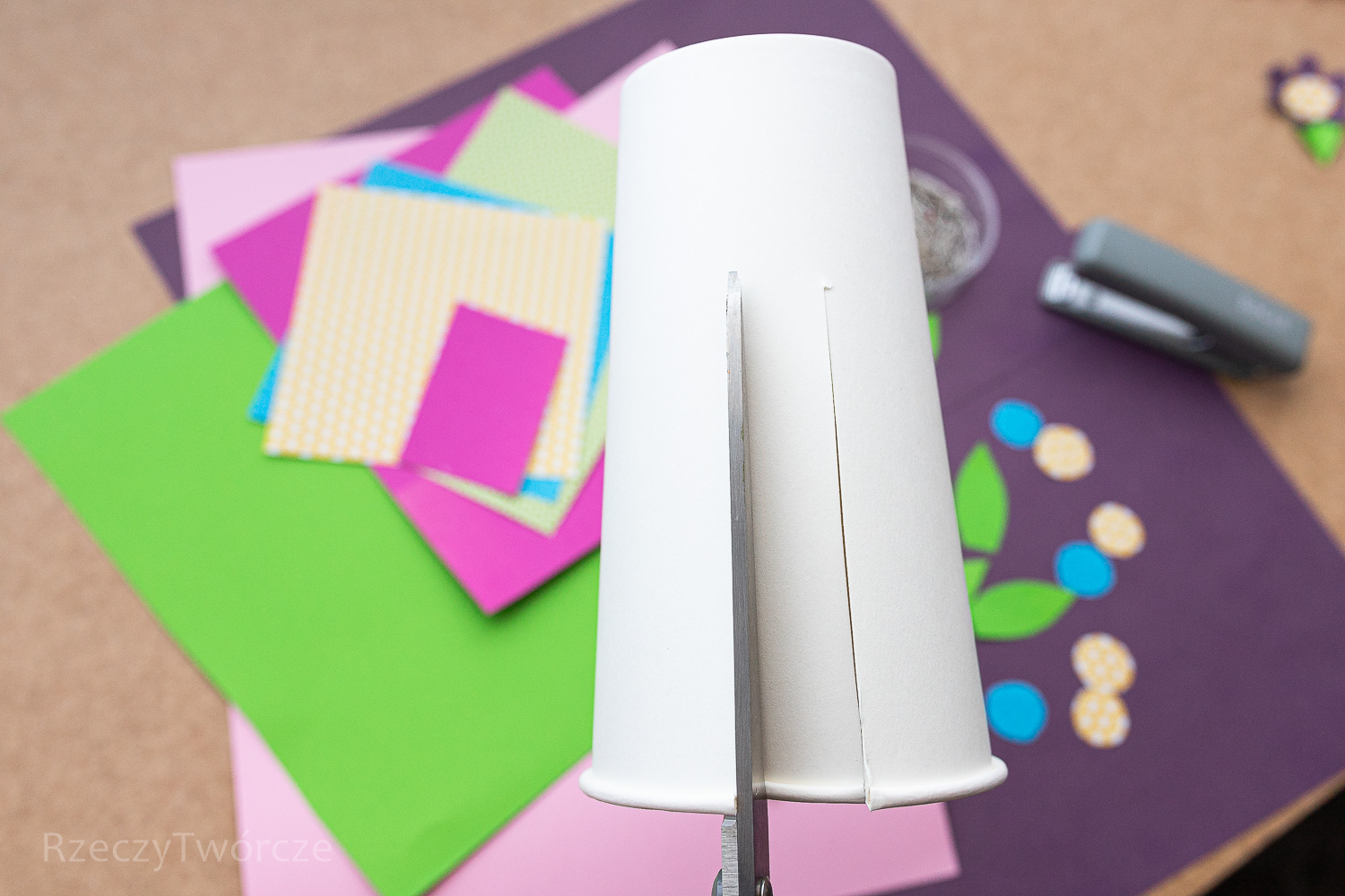 kubek papierowy duży, kolorowe kartki, szpilki, klej, nożyczki, spinacz