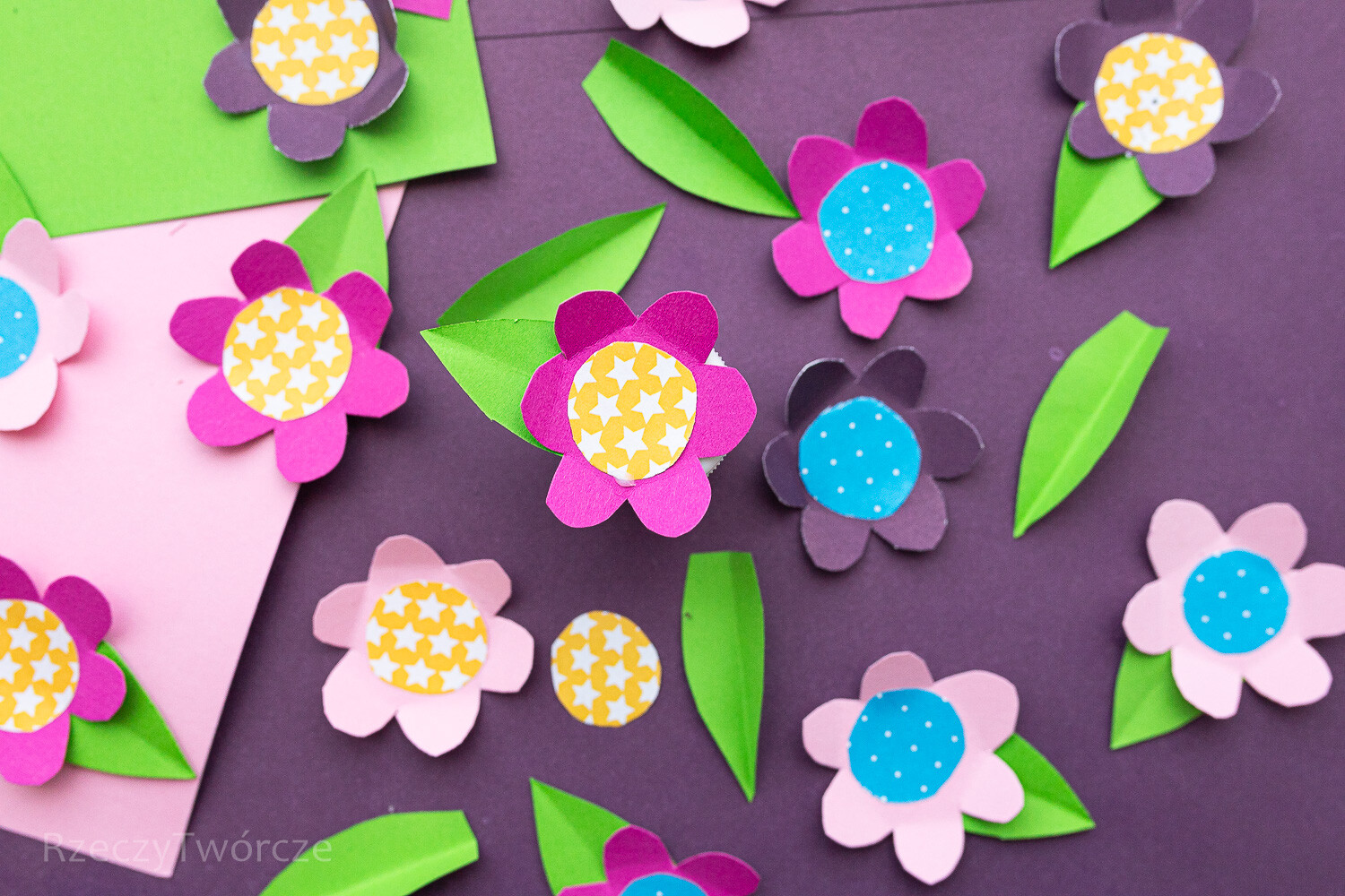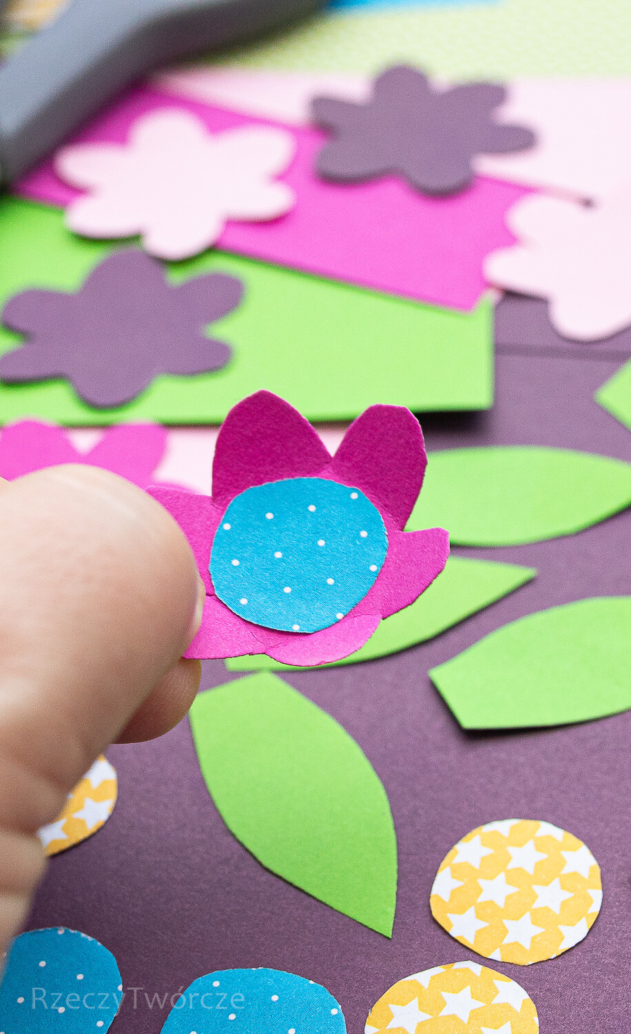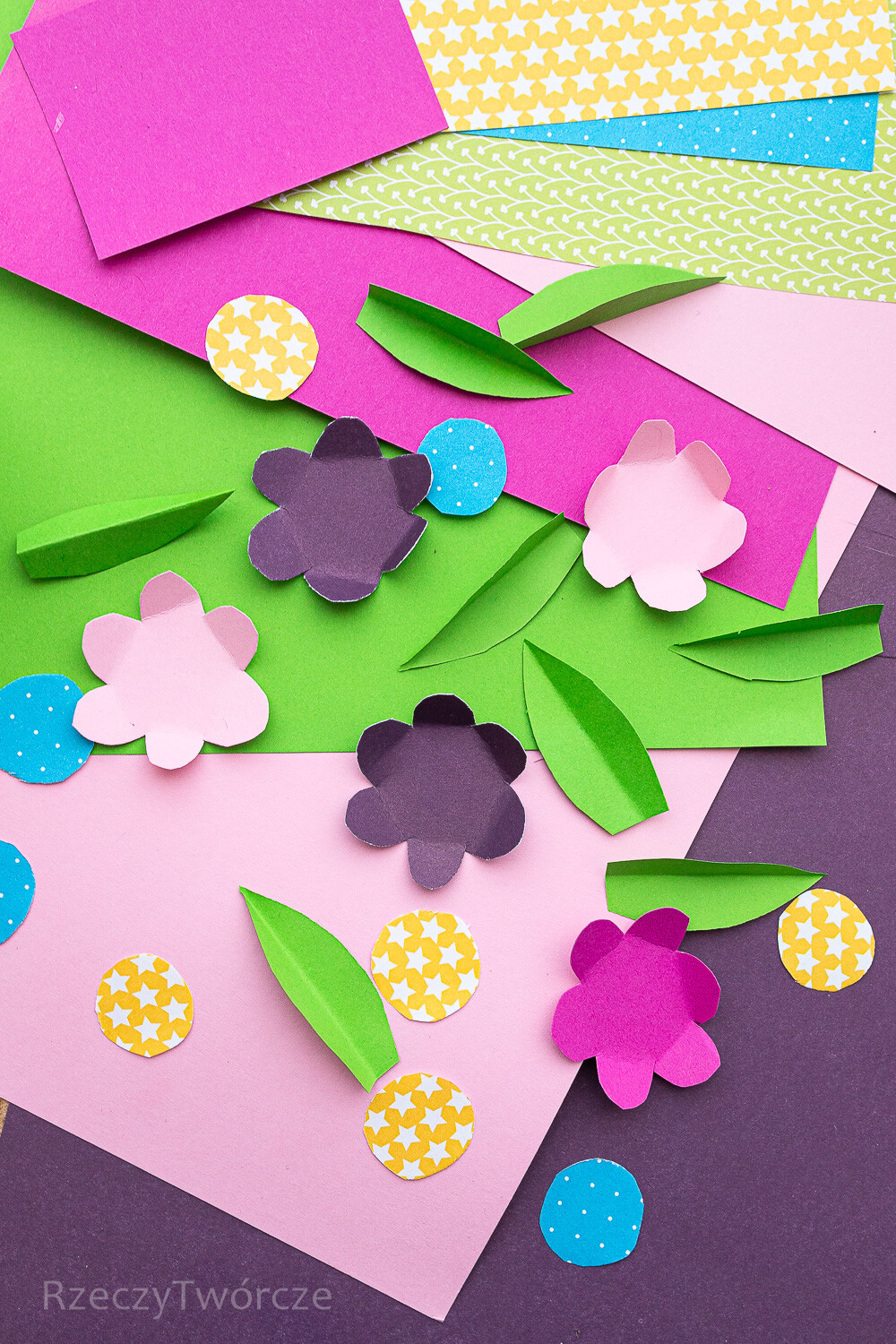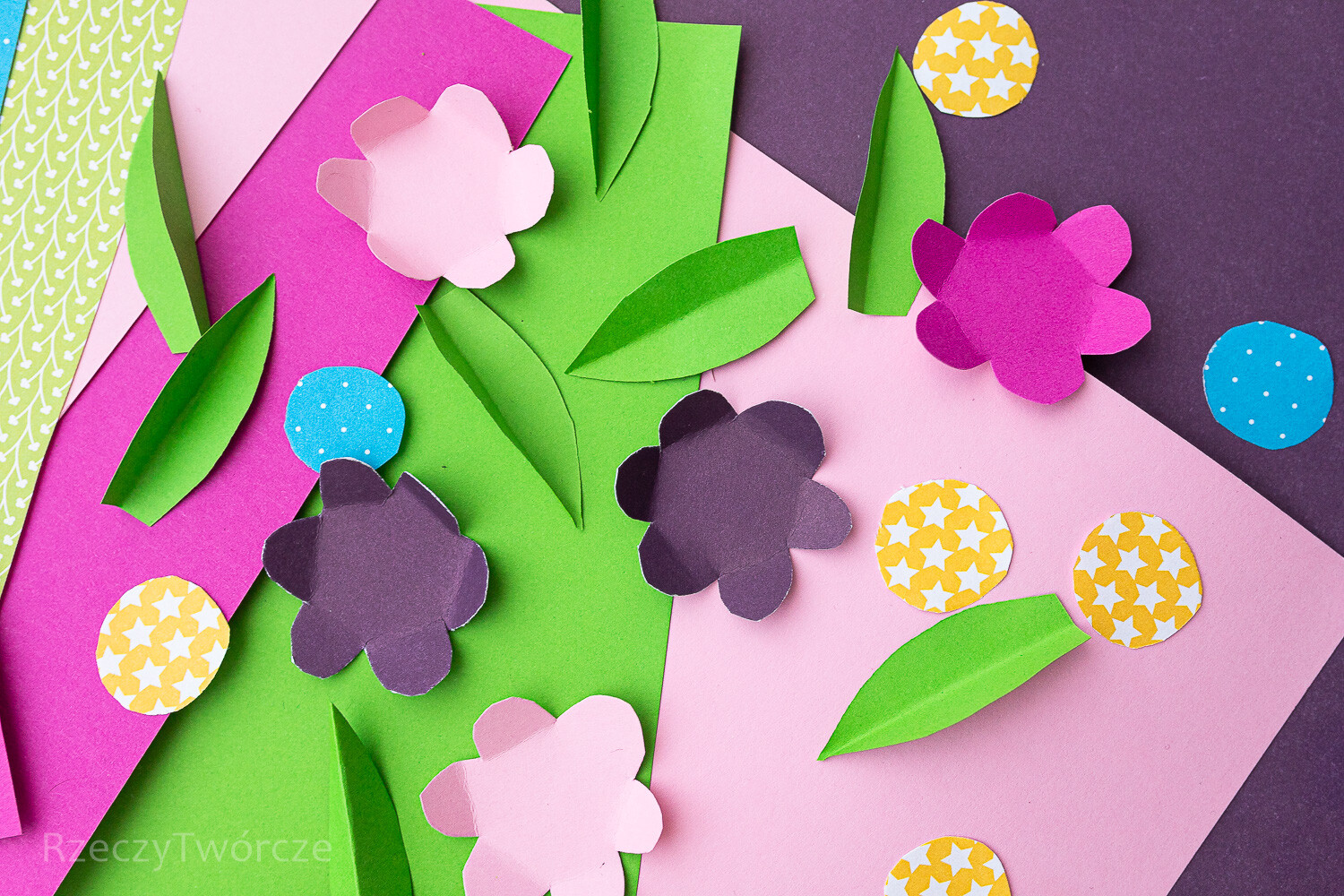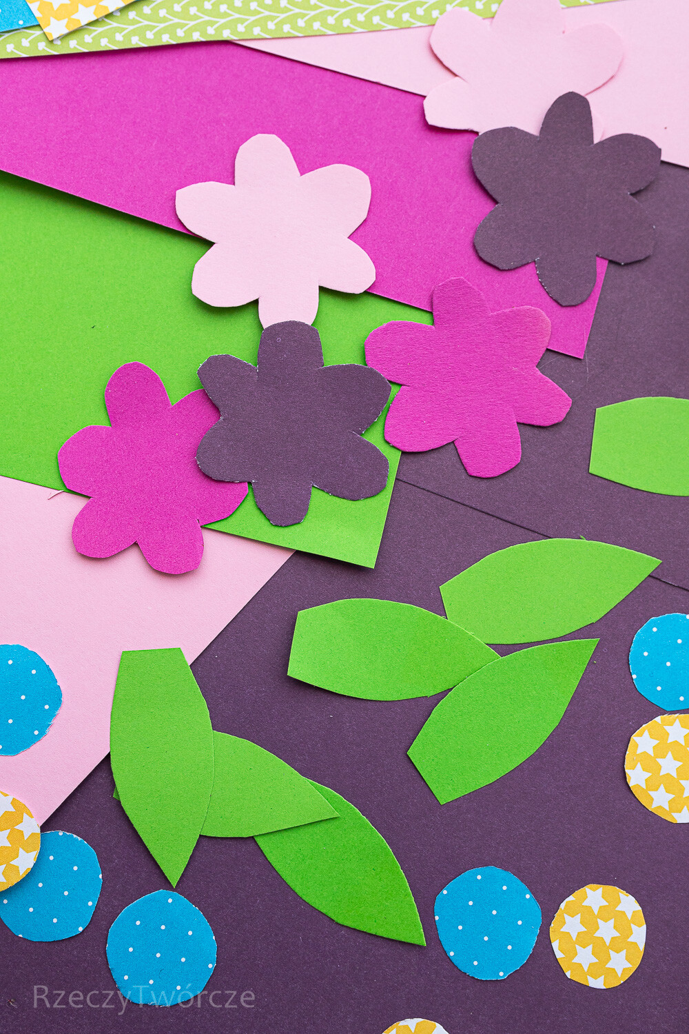 Teraz czas na wycięcie kwiatków. Z dowolnych kolorów wycinamy małe kształty okrągłych kwiatków kilku-płatkowych i te płatki zaginamy do góry. Na powstały środek ponaklejamy kółeczka - będą to środki kwiatów, które możemy wyciąć z ozdobnych kartek jeśli mamy takie. Trzeba jeszcze powycinać zielone listki i podkleić nimi każdy kwiatek, zginając je wcześniej na pół aby były bardziej przestrzenne.