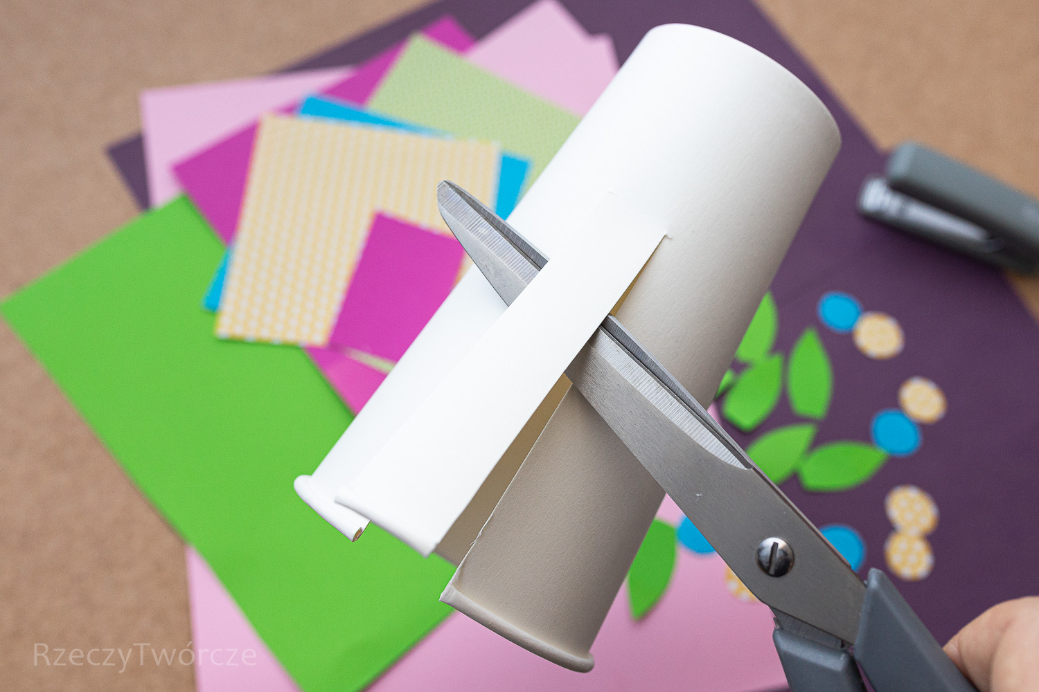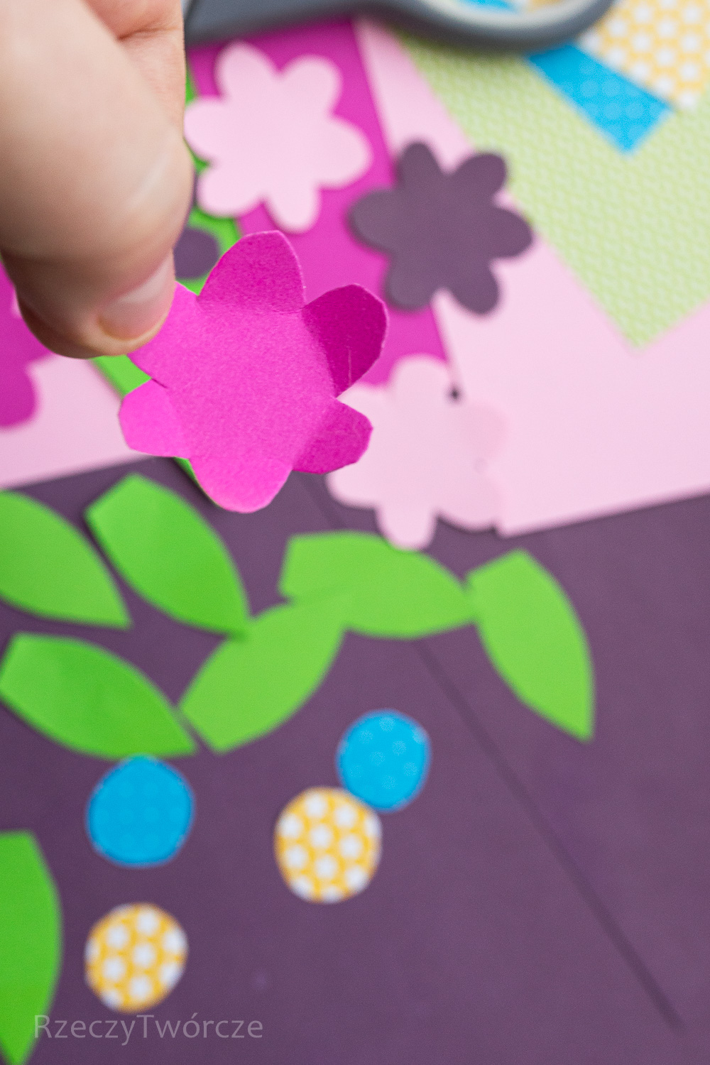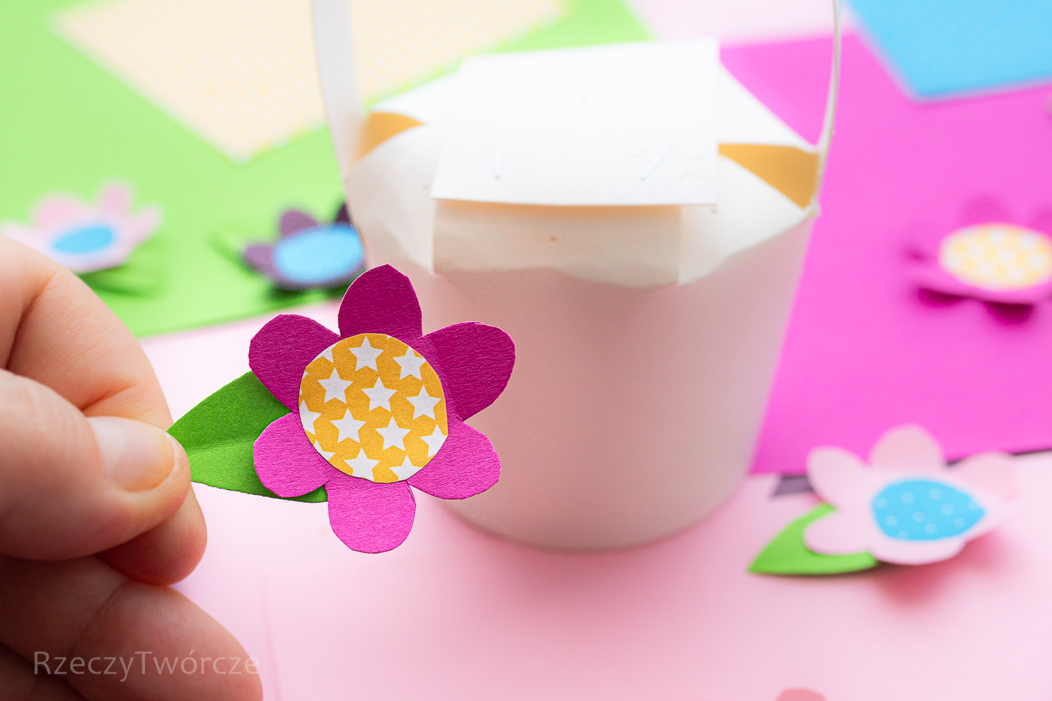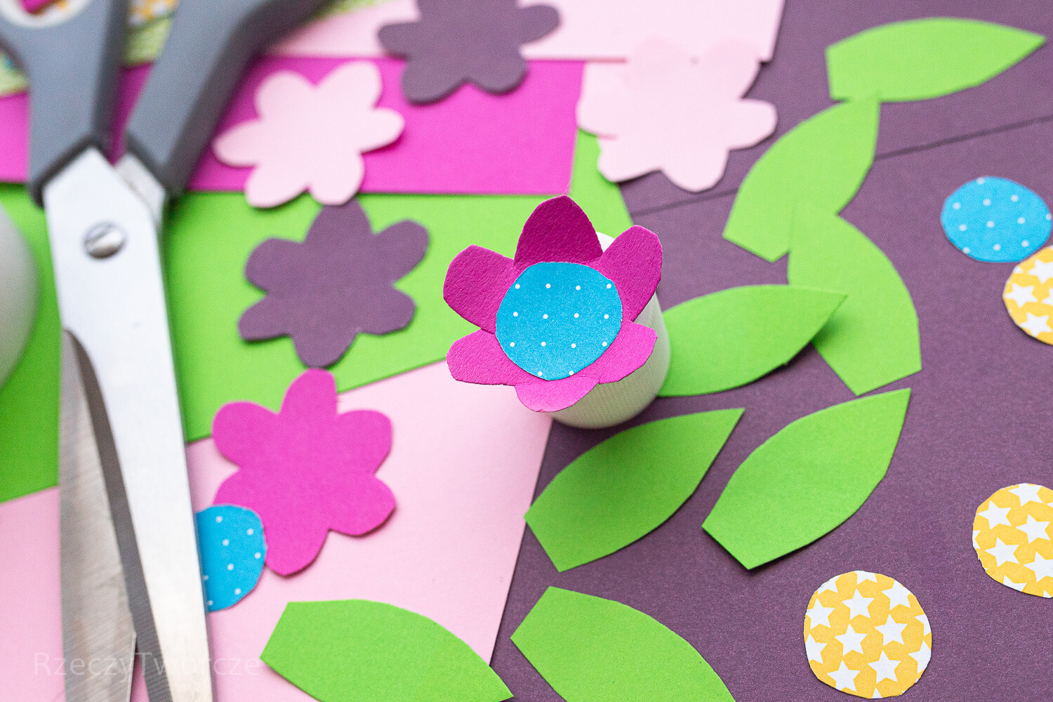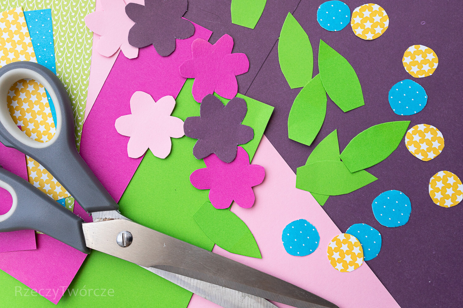 Teraz czas na wycięcie kwiatków. Z dowolnych kolorów wycinamy małe kształty okrągłych kwiatków kilku-płatkowych i te płatki zaginamy do góry. Na powstały środek ponaklejamy kółeczka - będą to środki kwiatów, które możemy wyciąć z ozdobnych kartek jeśli mamy takie. Trzeba jeszcze powycinać zielone listki i podkleić nimi każdy kwiatek, zginając je wcześniej na pół aby były bardziej przestrzenne.