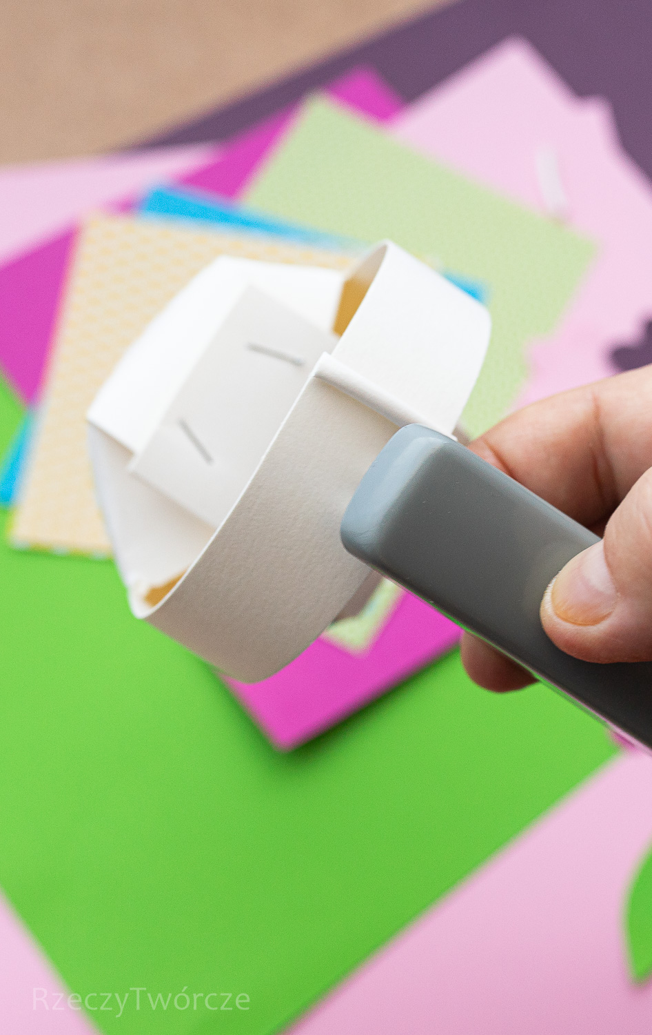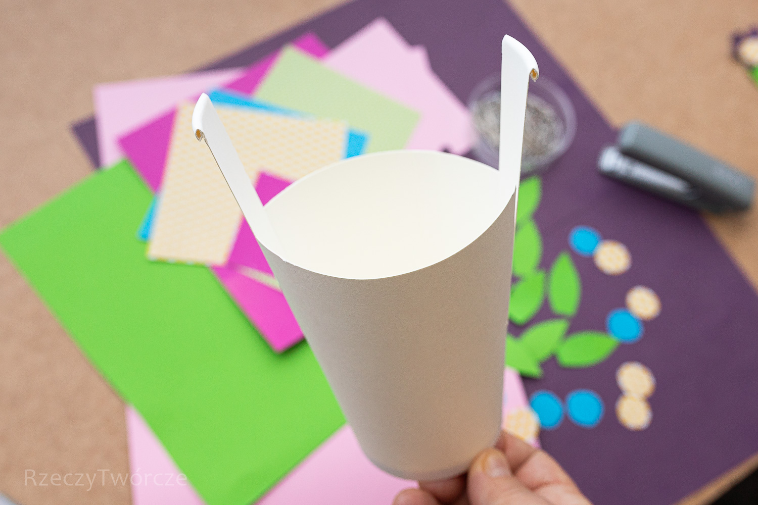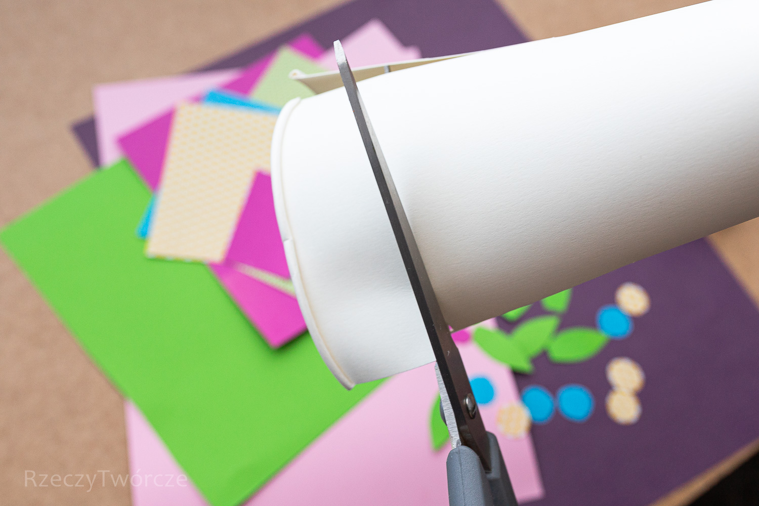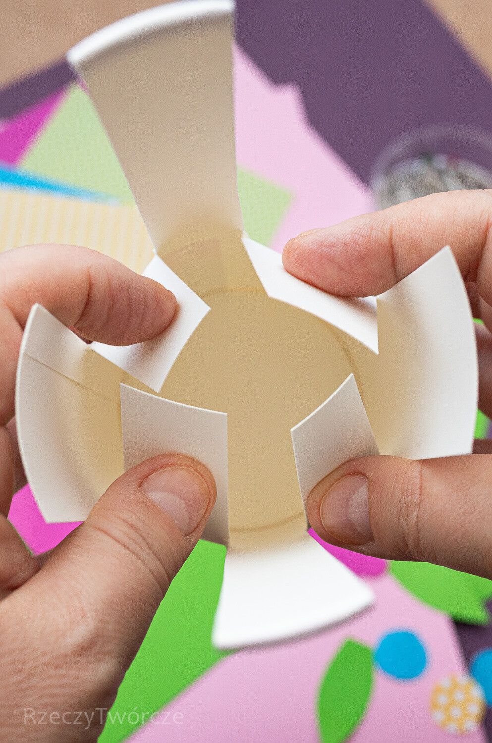 Zaczynamy od wycięcia i skonstruowania koszyczka z kubka: najpierw nacinamy kubek wzdłuż z dwóch stron w taki sposób, aby uzyskać dwa paski, które po ich połączeniu utworzą rączkę koszyka. Długość tych pasków powinna wynosić mniej więcej 2/3 wysokości kubeczka. Pozostałe po ucięciu 2 szerokie pasy (te pomiędzy wydzielonymi paskami do utworzenia uchwytu koszyka) skracamy mniej więcej o połowę ich długości, a następnie tniemy te skrócone pasy jeszcze na 3 węższe, przy czym środkowy pasek powinien być szerszy od dwóch pozostałych. Mamy więc ponacinany kubek, w którym są dwa dłuższe paski na rączkę i 6 krótszych. Zanim połączymy nasze dłuższe paski w uchwyt koszyczka musimy uformować "bazę", do której przymocujemy kwiatki. Zawijamy krótsze paski wszystkie do środka tak jak na zdjęciach poniżej. Dwa górne krótkie paski spinamy spinaczem (możemy je też skleić mocnym klejem magicznym lub klejem na gorąco).