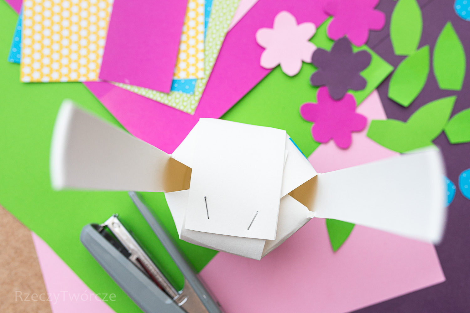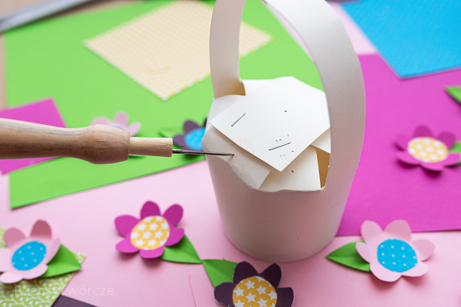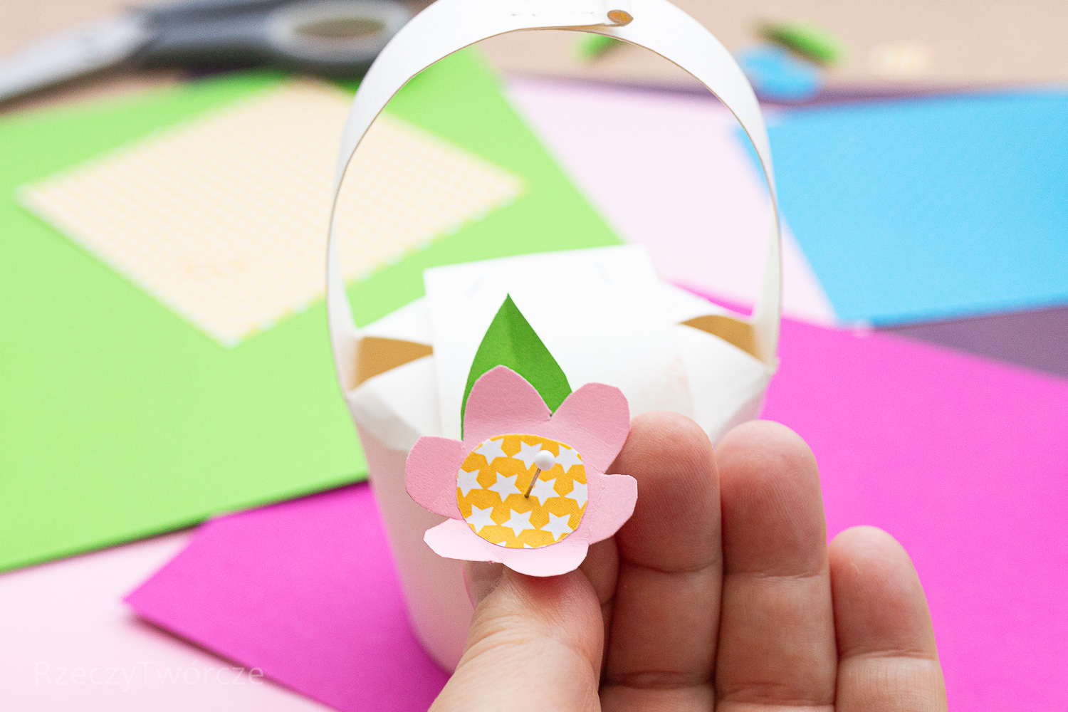 Jest to zadanie nieco trudniejsze, przy większych grupach raczej dla starszych dzieci. Z maluchami można wykonać kilka koszyczków, do których dzieci wytną kwiatki i listki, a opiekun wykona koszyczki i pomoże zamocować kwiaty.