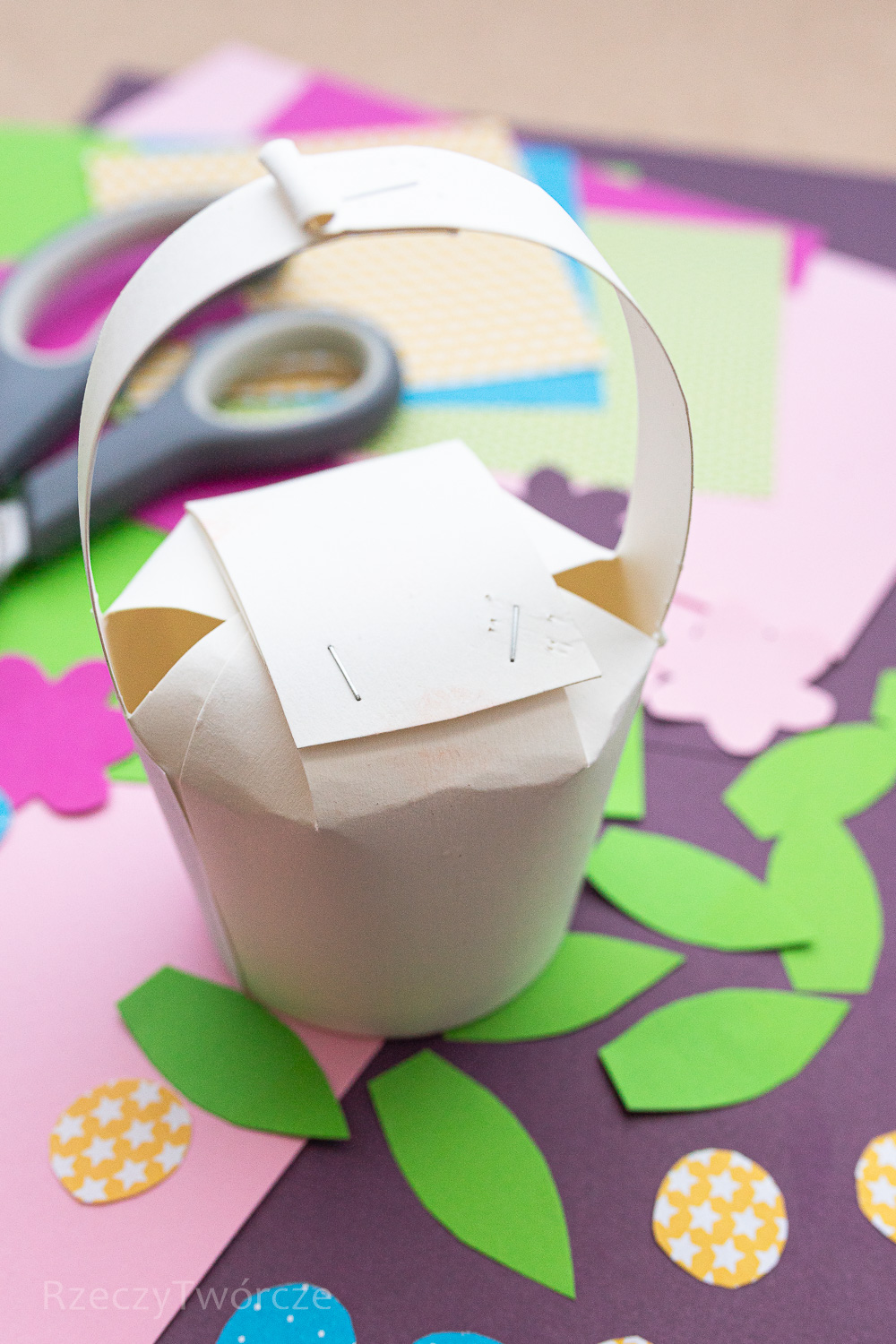 Mając już gotową bazę spinamy lub sklejamy u góry rączkę koszyka.