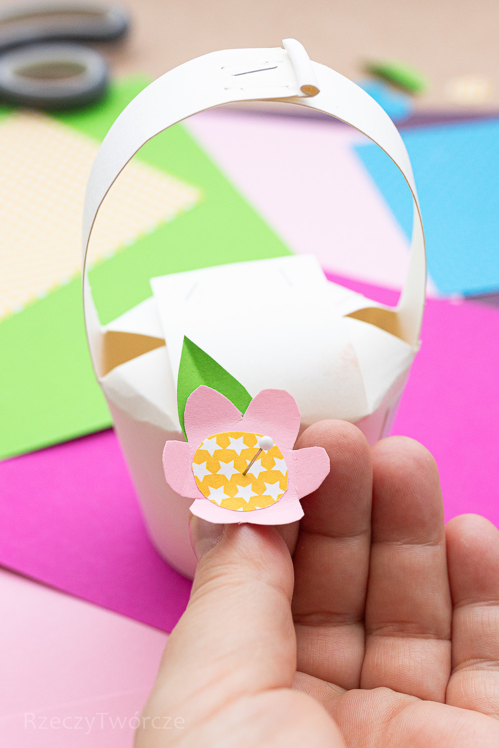 Na koniec montujemy kwiaty w koszyku, co oznacza ich przypięcie szpilkami lub przyklejenie do naszej "bazy". Ja akurat nie miałam pod ręką kleju magicznego ani na gorąco, więc postanowiłam przyszpilić moje kwiaty. Dla ułatwienia można nakłuć dziurki w miejscach, gdzie chcemy mieć kwiaty. Na rączce koszyczka doklejamy jeden z kwiatków i gotowe!