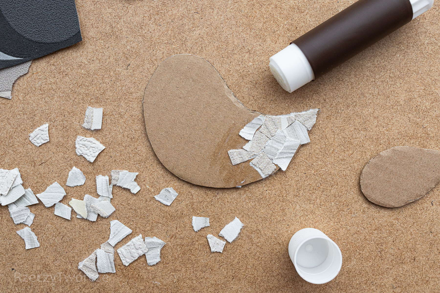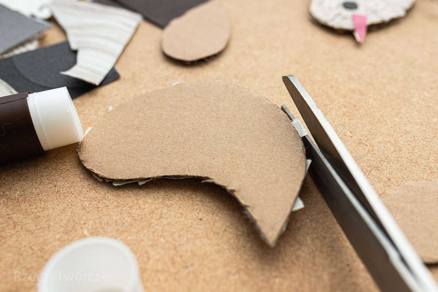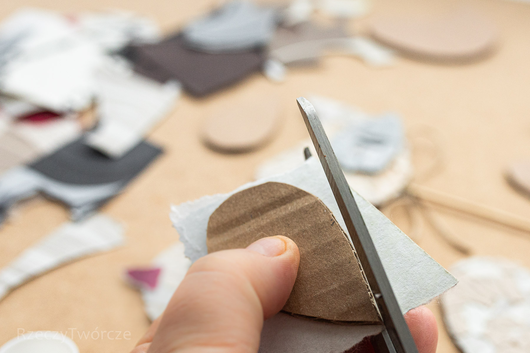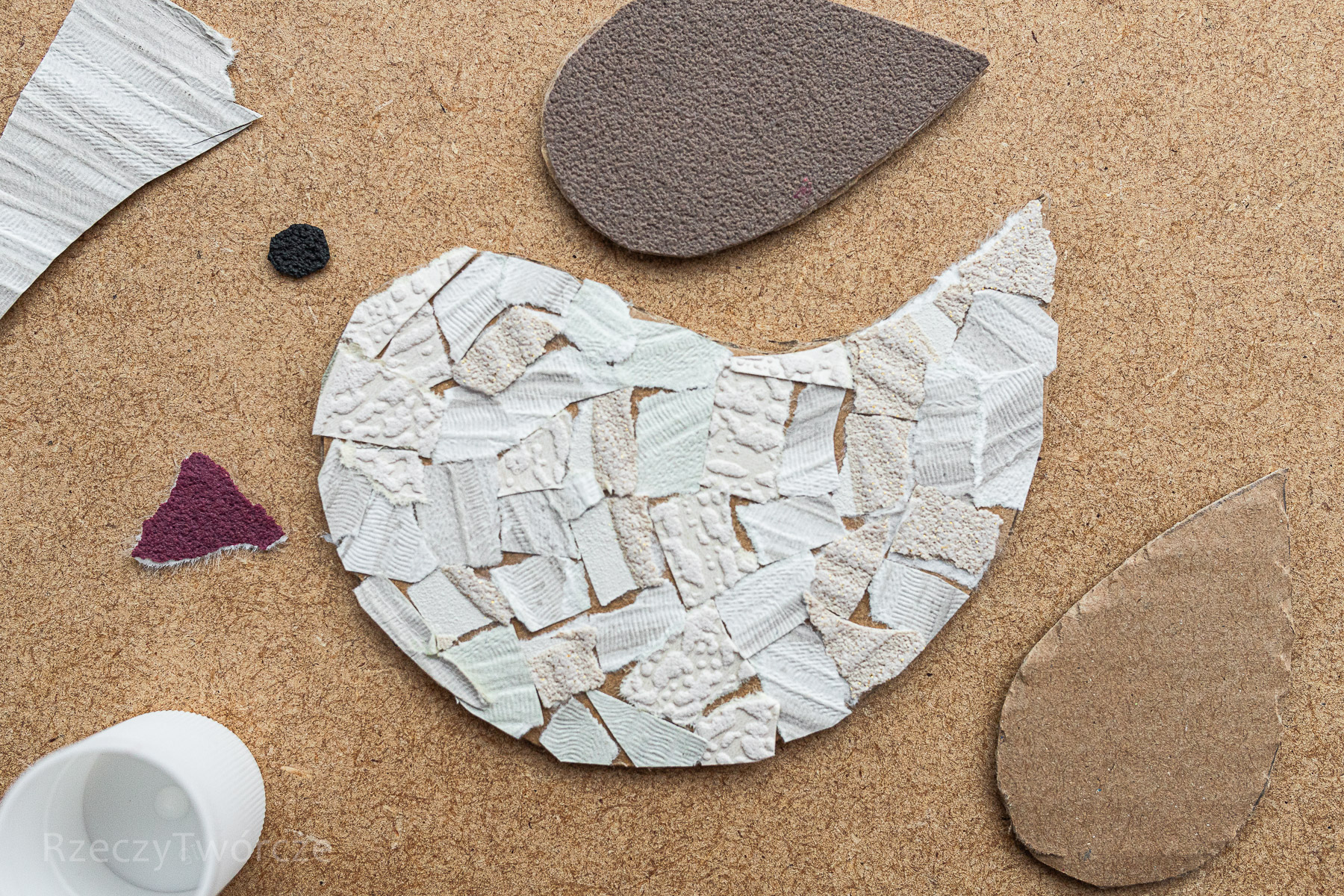 ścinki kolorowych tapet, karton, szablon, ołówek, klej i nożyczki, ewentualnie patyczek do szaszłyków i sznurek