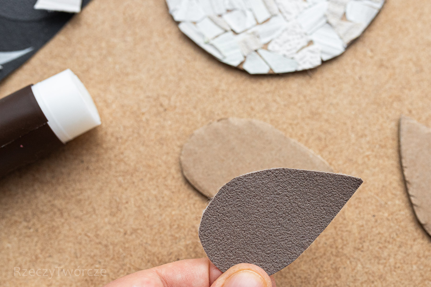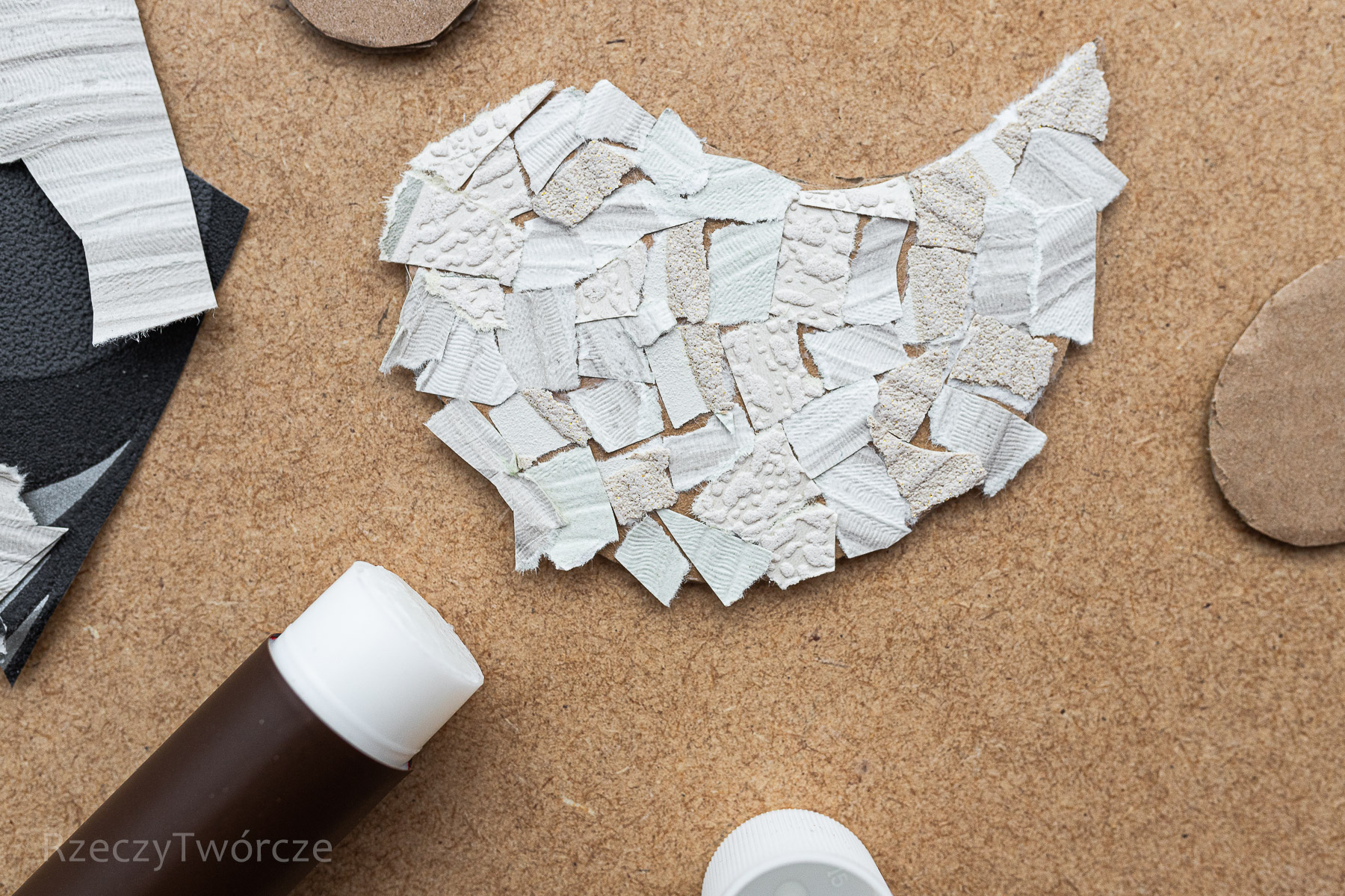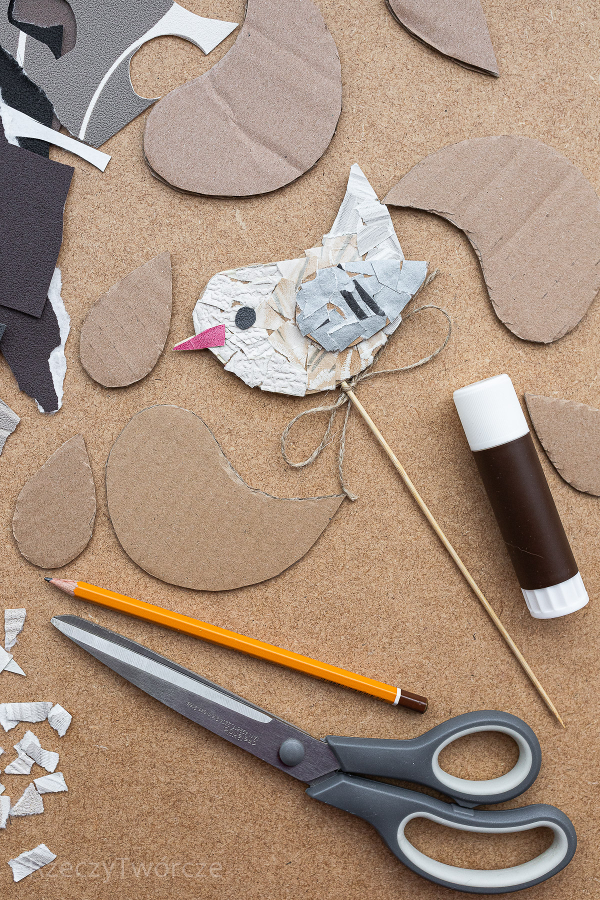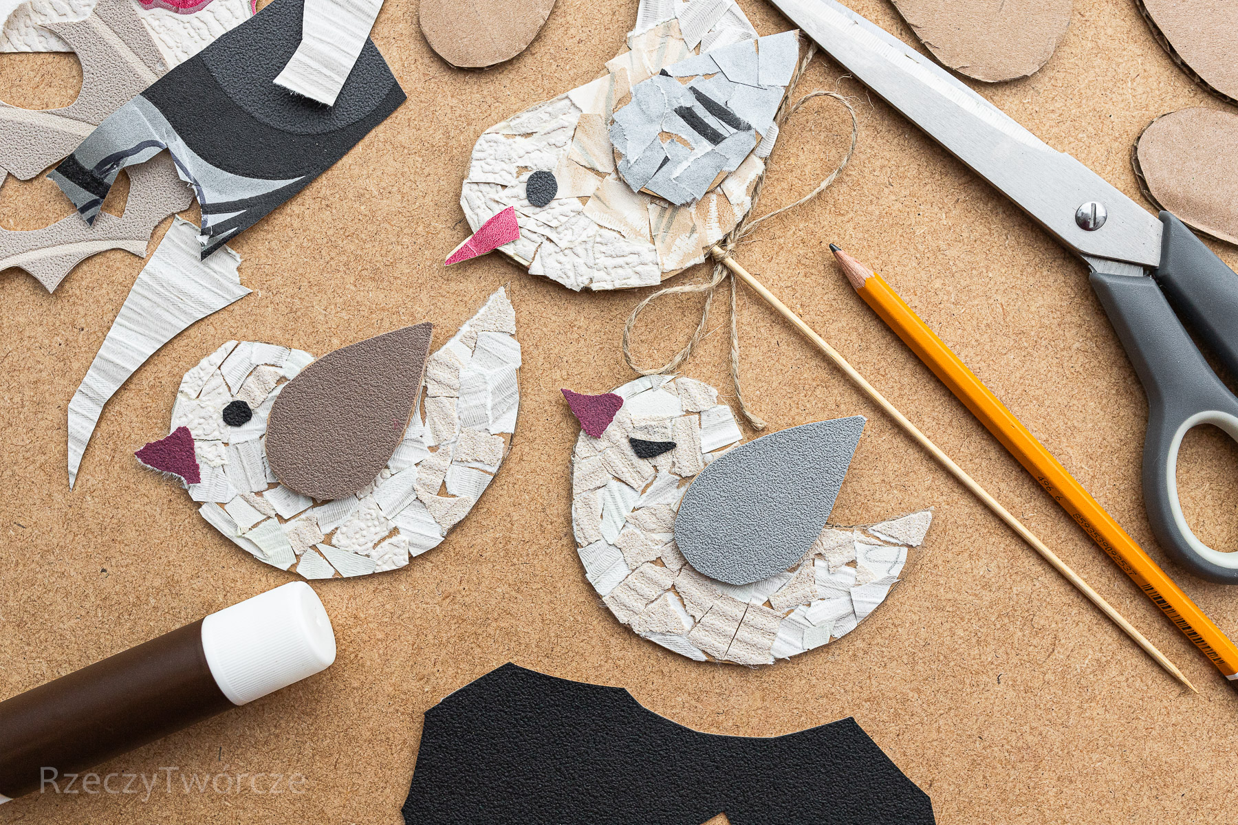 Odrysowujemy szablon na kartonie i wycinamy brzuszek oraz dwa skrzydełka. Tapety rwiemy na drobne kawałeczki, które za chwilę nakleimy na wycięty brzuszek ptaszka z dwóch stron. Skrzydełka również oklejamy tapetą: można dla kontrastu wykleić je jednym kawałkiem. Wycinamy/wyrywamy oczka i dzióbek po dwa razy i doklejamy wszystkie elementy z dwóch stron naszego zwierzątka. Możemy zamontować patyczek i obwiązać go sznurkową kokardką, lub zrobić zawieszkę ze sznurka. Tak wykonane ptaszki będą piękną ozdobą na wiosennym stole lub parapecie z kwiatami:)