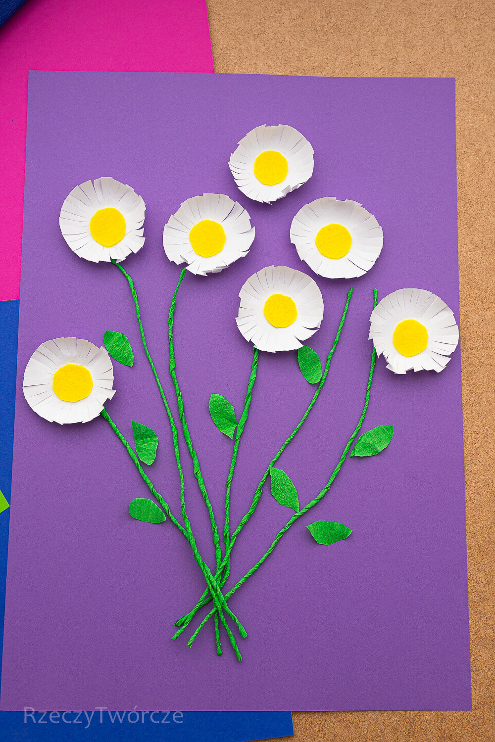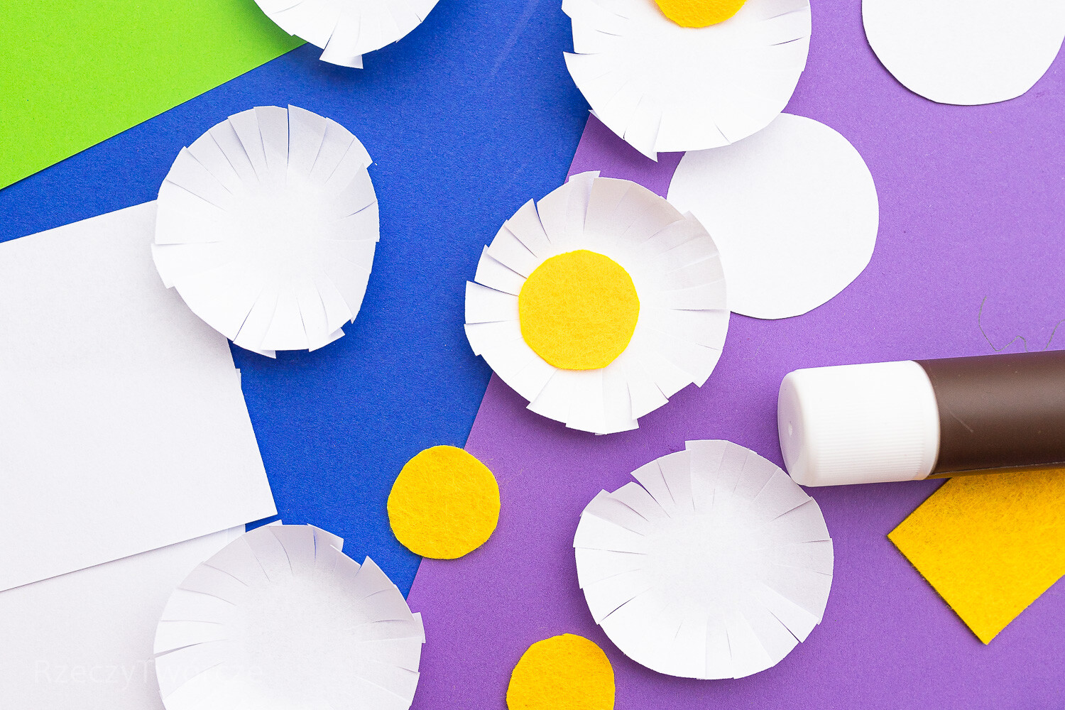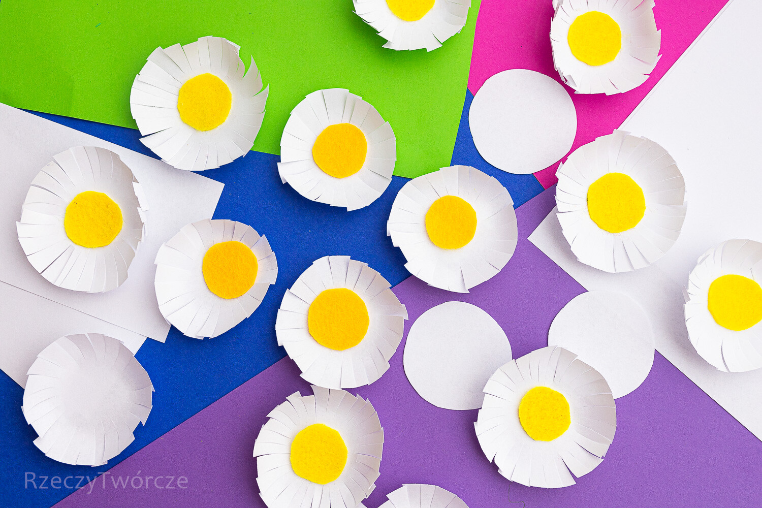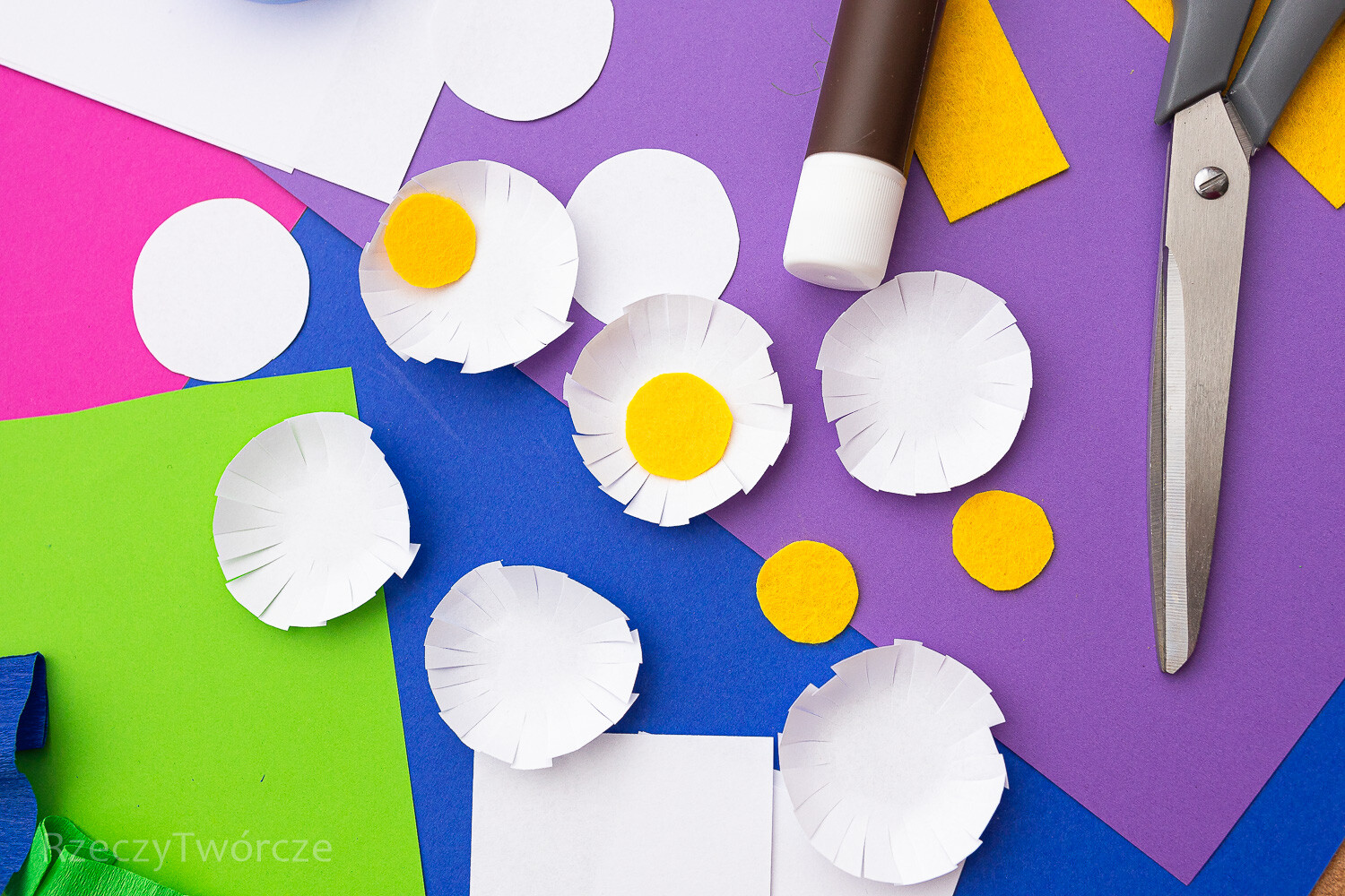 Odrysowujemy kółka na białej kartce: mogą być w jednym rozmiarze, ale też ciekawy efekt uzyskamy jeśli wytniemy kółka większe i mniejsze - będą to nasze kwiatki - przypominają one stokrotki czy rumianki, a moi uczniowie słusznie zaobserwowali, że wyglądają jak jajka sadzone:) Polecam wycinać kółka po kilka na raz, ze składanych pasków papieru. Następnie nacinamy kółeczka w kierunku do ich środka tak, aby powstały dookoła płatki. Warto sobie skrócić czas pracy nacinając kilka kółek razem. Z żółtej kartki lub najlepiej filcu wycinamy okrągłe środki kwiatów. Zanim wkleimy środki, warto zaokrąglić końce płatków, przeciągając brzegi czymś tępym (końcówkę nożyczek, ołówka itp.) Po wklejeniu środków czas na wykonanie zielonych łodyżek i listków. Można zrobić je z bibuły, najpierw skręcając podłużne jej paski, a następnie wycinając listki. Możemy również wykonać je z zielonego papieru, wycinamy wtedy cieniutkie paski i liście. Układamy całość bukietu na kolorowej sztywnej kartce i kiedy jesteśmy zadowoleni z efektu, doklejamy elementy. Na sam koniec przyklejamy kokardę, którą można wykonać ze wstążki, tasiemki, sznurka czy zwiniętego paska bibuły. Jeśli bukiet ma być prezentem na daną okazję, warto wypisać karteczkę z życzeniami lub nazwą okazji i przykleić w dogodnym miejscu. Oczywiście można pokusić się o dodatkowe elementy jak motyle czy biedronki, jednak warto tu zachować zdrowy umiar. Przy takich okolicznościowych kompozycjach sprawdza się zasada: "Co za dużo, to niezdrowo"
