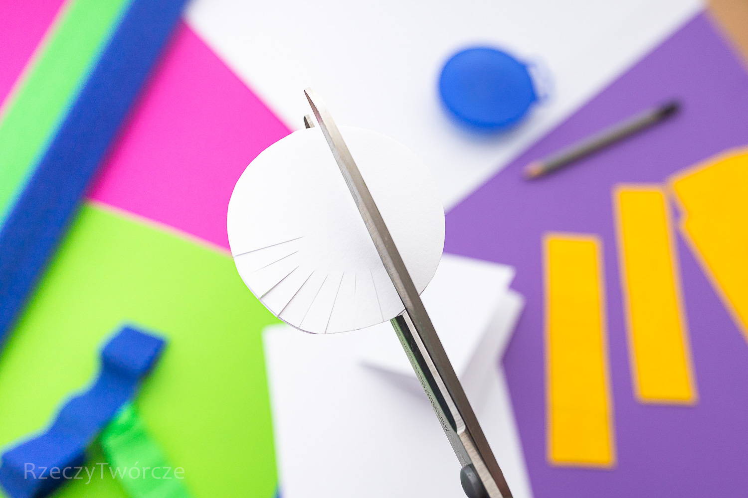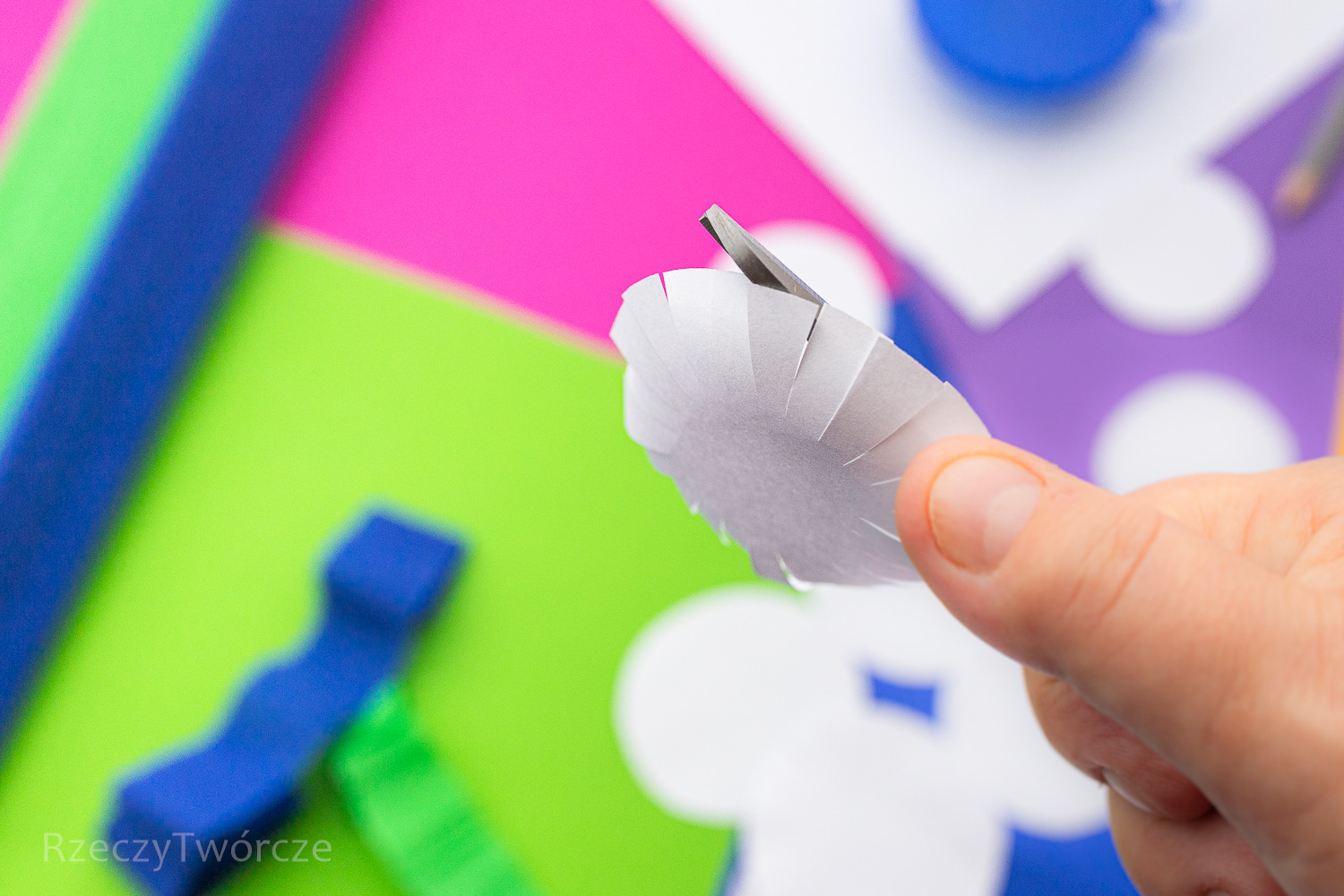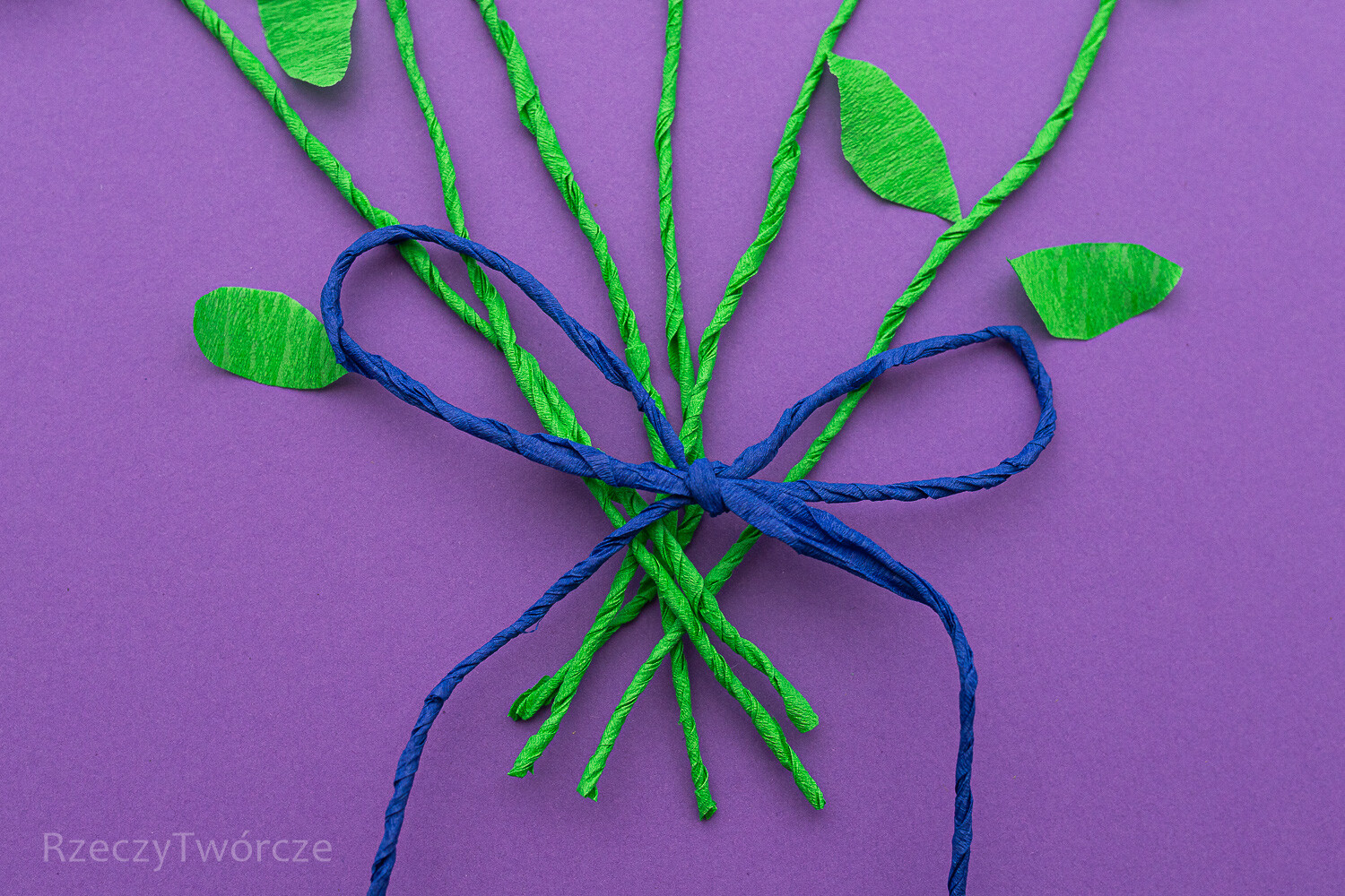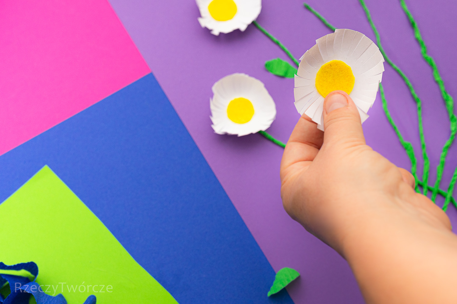 Odrysowujemy kółka na białej kartce: mogą być w jednym rozmiarze, ale też ciekawy efekt uzyskamy jeśli wytniemy kółka większe i mniejsze - będą to nasze kwiatki - przypominają one stokrotki czy rumianki, a moi uczniowie słusznie zaobserwowali, że wyglądają jak jajka sadzone:) Polecam wycinać kółka po kilka na raz, ze składanych pasków papieru. Następnie nacinamy kółeczka w kierunku do ich środka tak, aby powstały dookoła płatki. Warto sobie skrócić czas pracy nacinając kilka kółek razem. Z żółtej kartki lub najlepiej filcu wycinamy okrągłe środki kwiatów. Zanim wkleimy środki, warto zaokrąglić końce płatków, przeciągając brzegi czymś tępym (końcówkę nożyczek, ołówka itp.) Po wklejeniu środków czas na wykonanie zielonych łodyżek i listków. Można zrobić je z bibuły, najpierw skręcając podłużne jej paski, a następnie wycinając listki. Możemy również wykonać je z zielonego papieru, wycinamy wtedy cieniutkie paski i liście. Układamy całość bukietu na kolorowej sztywnej kartce i kiedy jesteśmy zadowoleni z efektu, doklejamy elementy. Na sam koniec przyklejamy kokardę, którą można wykonać ze wstążki, tasiemki, sznurka czy zwiniętego paska bibuły. Jeśli bukiet ma być prezentem na daną okazję, warto wypisać karteczkę z życzeniami lub nazwą okazji i przykleić w dogodnym miejscu. Oczywiście można pokusić się o dodatkowe elementy jak motyle czy biedronki, jednak warto tu zachować zdrowy umiar. Przy takich okolicznościowych kompozycjach sprawdza się zasada: "Co za dużo, to niezdrowo"