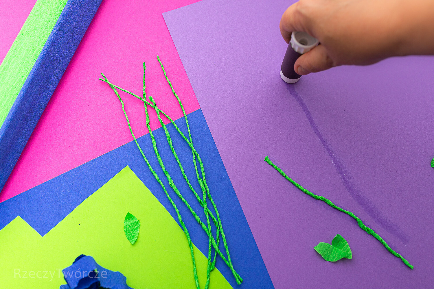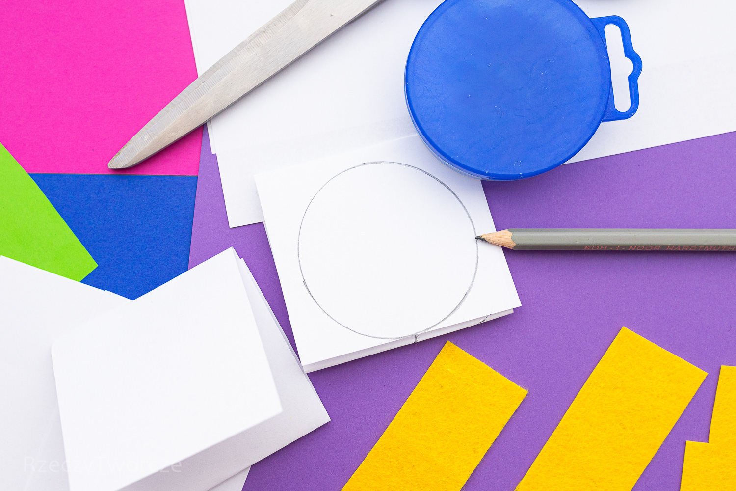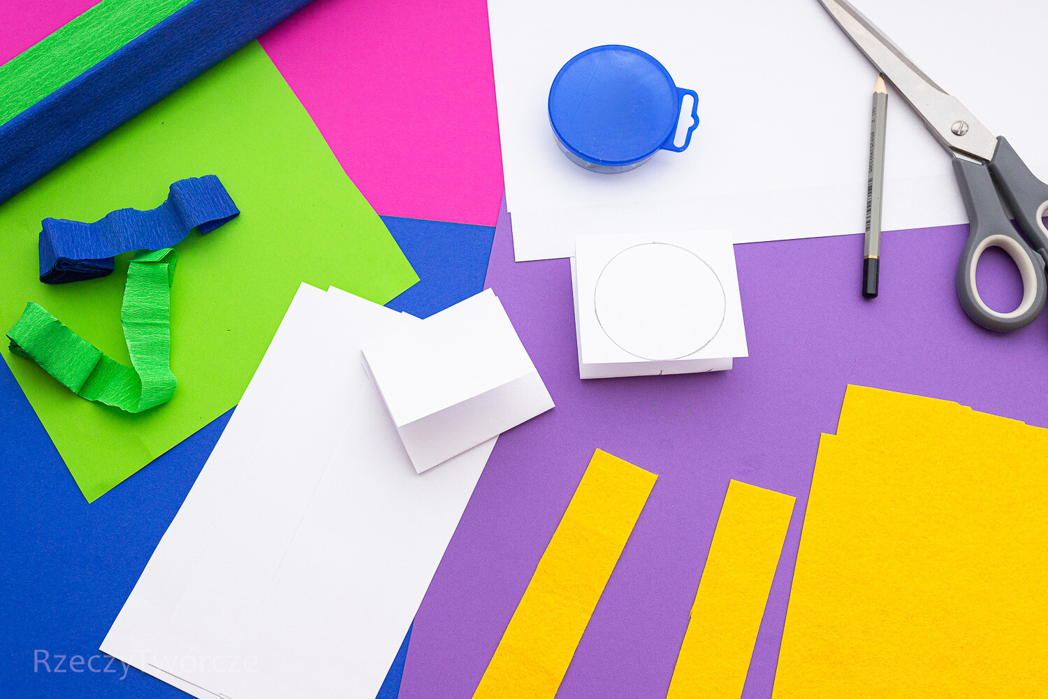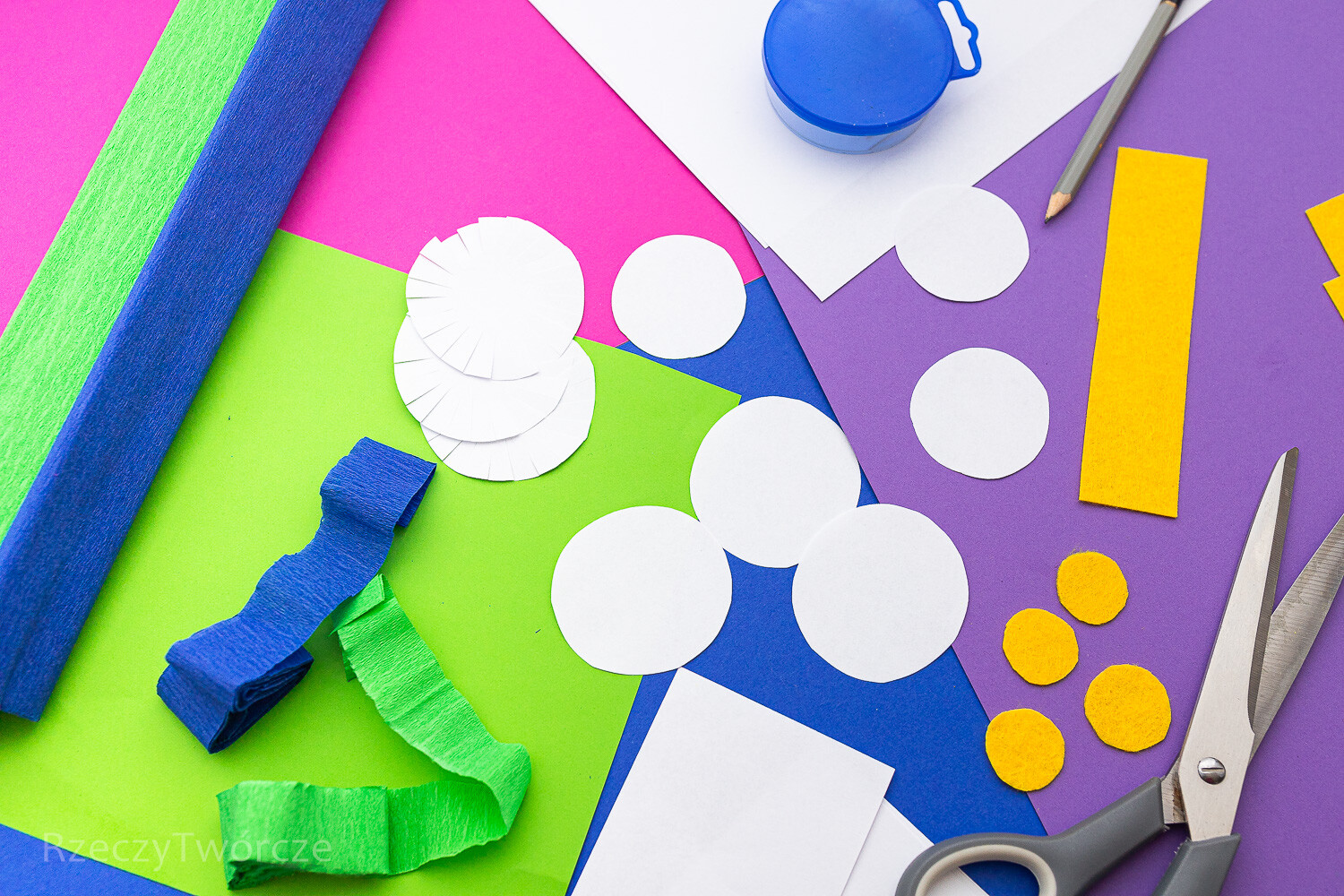 kartkę techniczną kolorową minimum A4 na tło w kolorze innym niż biały, kartkę cienką białą, żółte ścinki papieru lub filcu, zieloną bibułę lub kartkę, coś na kokardkę (wstążka, sznurek lub bibuła) ołówek, klej i nożyczki, coś do odrysowania kółek (w różnych wielkościach)